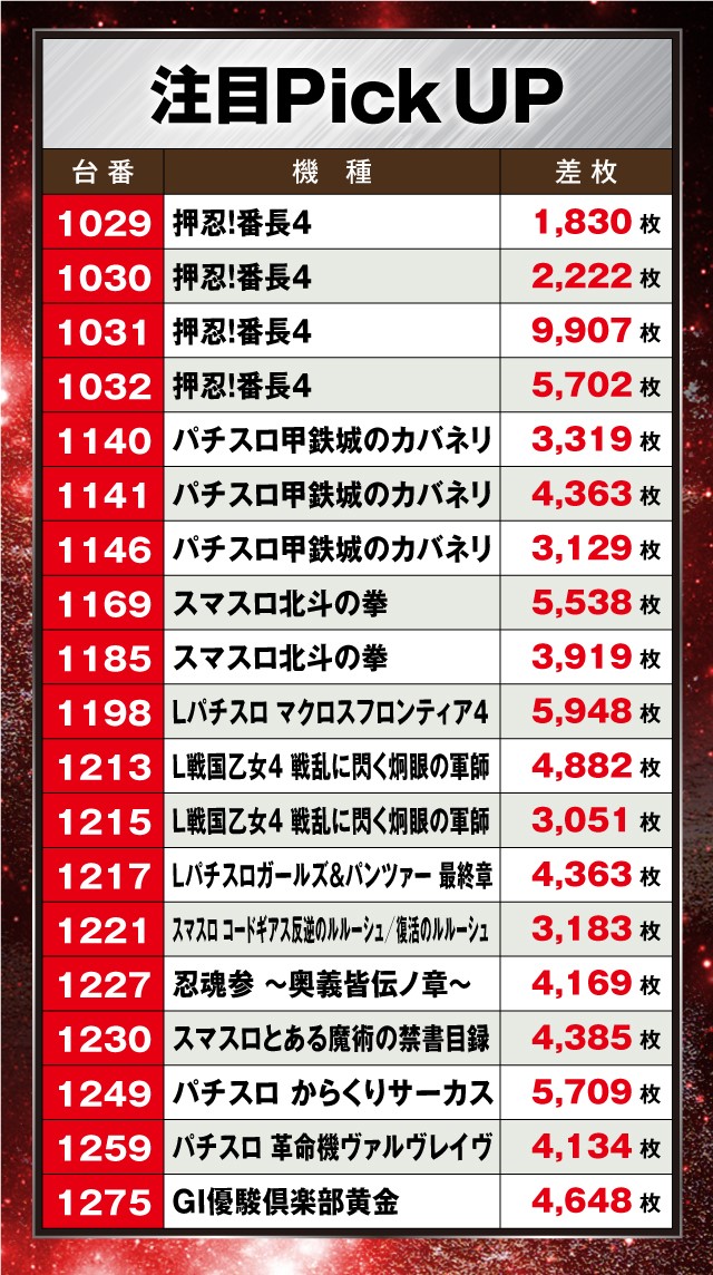 なかでも『押忍!番長4』が4台並びで注目を集めており、平均+4,915枚と機種性能を最大限に発揮していた。