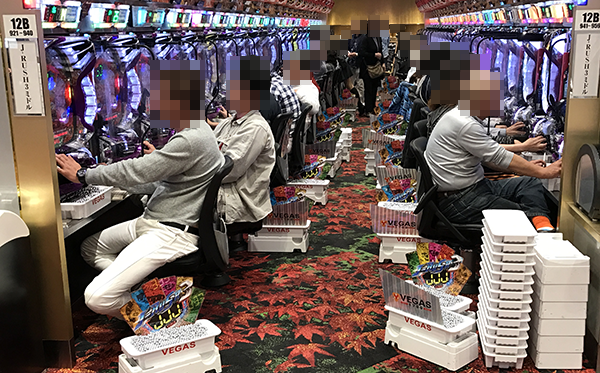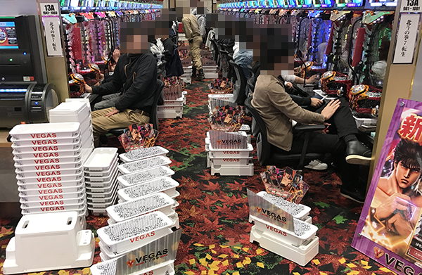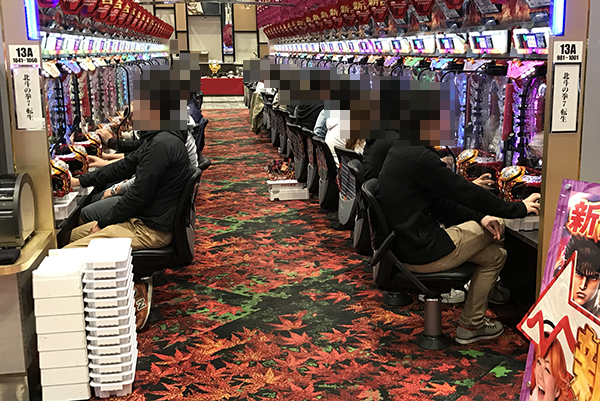 15時をまわった頃の4円パチンコのなかで、ひときわ活気づいていたのが「ぱちんこCR北斗の拳7 転生」と「CRぱちんこ GANTZ」。シマ内に広がる鮮やかな光景は、満足度の高さをあらわしているようであった。