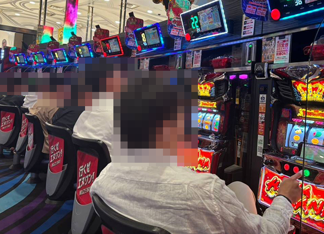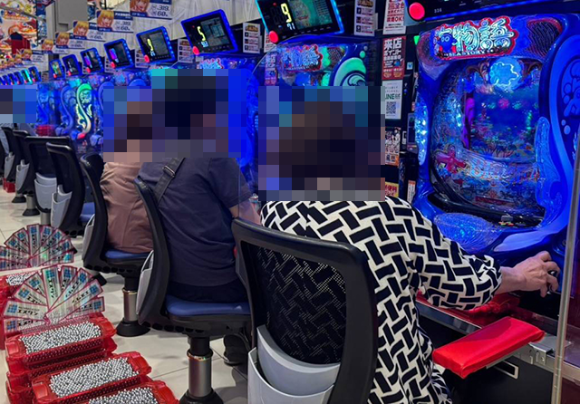 持ち玉を使い、笑顔で遊技をおこなう姿をカメラにおさめた。