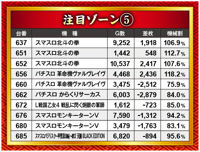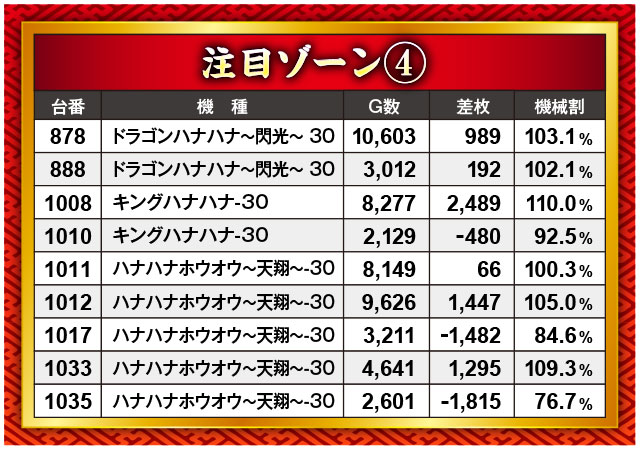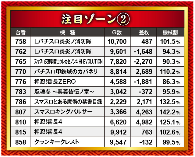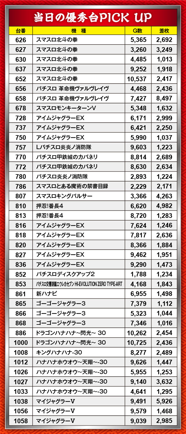 『押忍!番長4』と『スマスロキングパルサー』が揃って4,000枚オーバーを果たしたこのブロック。それ以外にもプラっている台が多く、確実に優秀台が潜んでいたのがうかがえた。