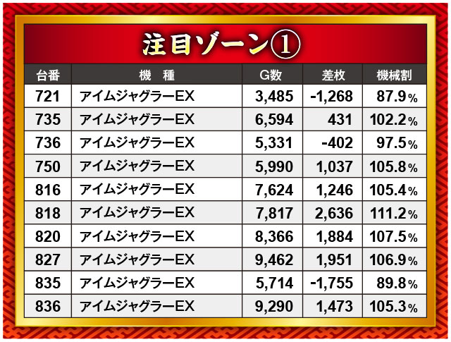 相変わらず多くのプラス台を目撃することとなった『アイムジャグラーEX』。これだけの台が5,000G以上回されてのプラス結果は、これらの台が優秀台だった証拠だろう。