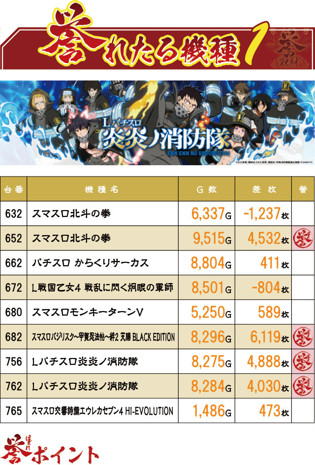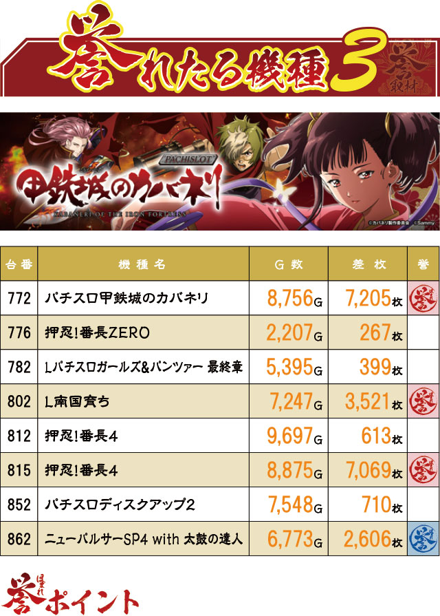 こちらのブロックからは、なんと7,000枚オーバー台が2台も誕生!やはり『パチスロ甲鉄城のカバネリ』と『押忍!番長4』は強かった。そして言うまでもなく…末尾②が多い…。
