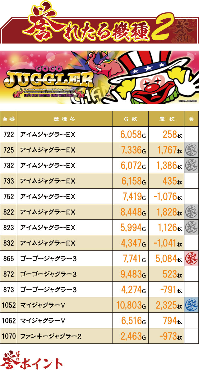 『ジャグラー』シリーズからも数多くのプラス台が飛び出した。注目は865番台が+5,000枚を突破していたこと。そしてこちらも末尾②の台が多いような…。