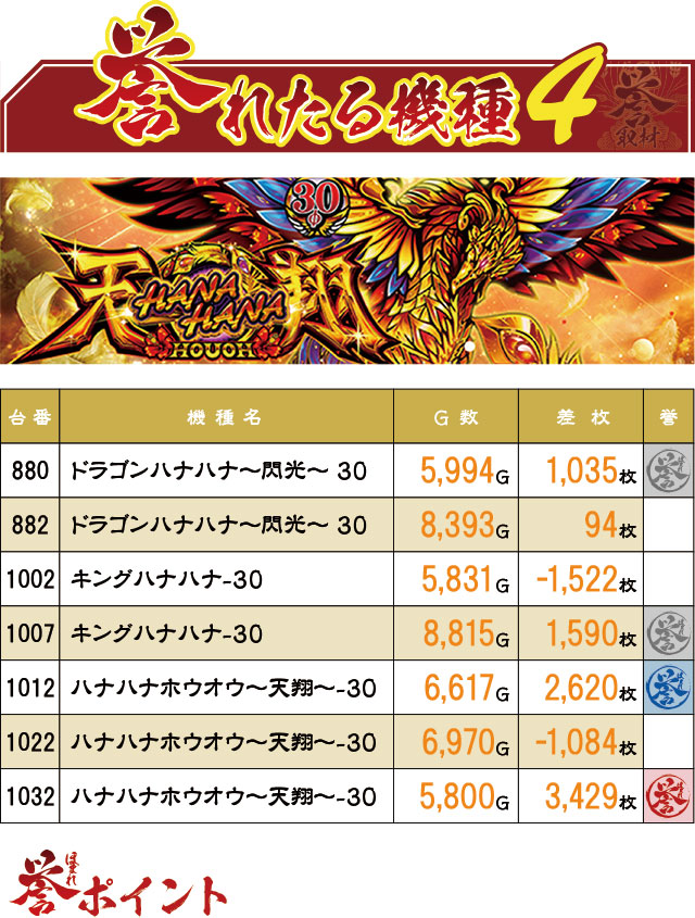 最後は『ハナハナ』シリーズの好調台を紹介。赤誉マークは1台に留まったものの、シマ内からはハイビスカスランプの輝きが途切れることはなかったようだ。そして…末尾②!