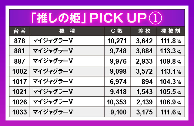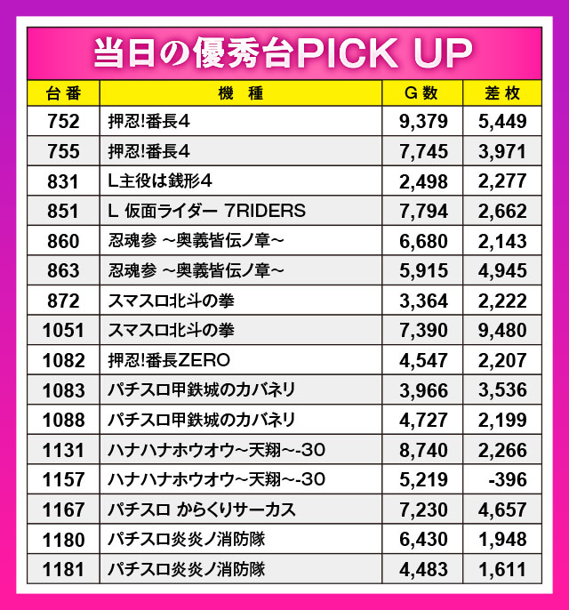 様々な機種から好結果が生まれたこの日。頭3つ分ほど飛び抜けた結果を叩き出したのは、1051番台の『スマスロ北斗の拳』で、その差枚は+9,480枚というのだから驚き。また上表を見て分かる通り、人気マシンには2台ずつ優秀台が配備されていた…!?