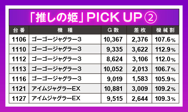 『ゴーゴージャグラー3』と『アイムジャグラーEX』でも3,000枚超えレコードに遭遇。それにしても当日のプラス台の多さを鑑みるに、相当数の優秀台が潜んでいたのは間違いなさそう。