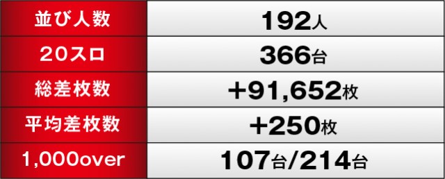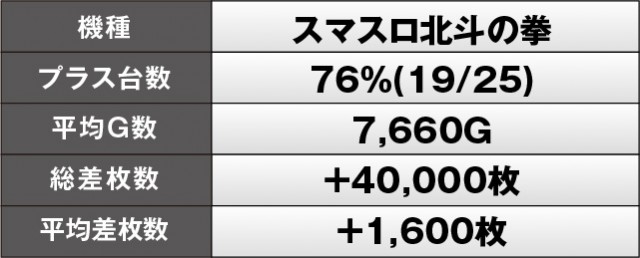 人気機種を中心に高い勝率をマークしていたのが印象的で、特に『スマスロ北斗の拳』は総差枚数+40,000枚と他を寄せつけない盛り上がりを披露していた。ほかの機種も軒並み活躍しており、平均差枚数の高さがその事実を物語っているだろう。全台プラス差枚を達成する台もあり、遊技していたファンは至福の時間を過ごせたはずだ。