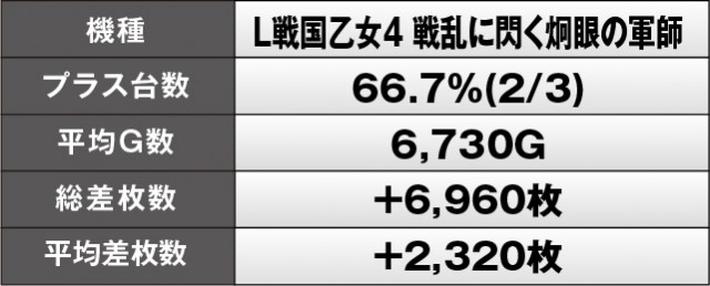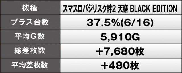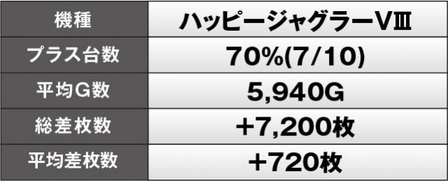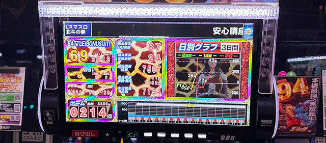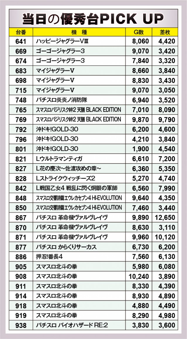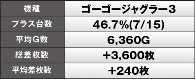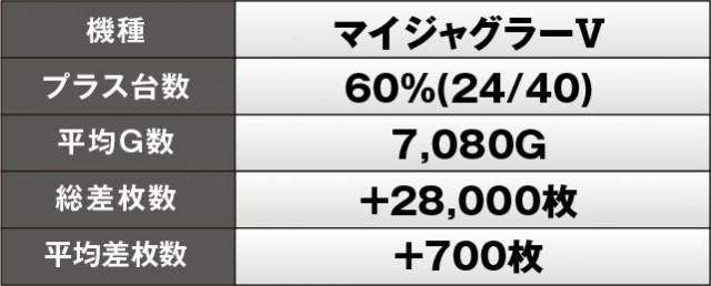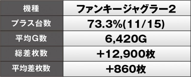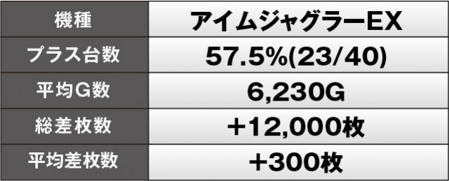 店内に設置された『ジャグラー』シリーズも負けてはおらず、『アイムジャグラーEX』『マイジャグラーⅤ』『ファンキージャグラー2』の3機種は総差枚数5桁を記録。コンスタントなボーナス当選はもちろんのこと、深くハマることなくGOGOランプが光り輝いていたのが如実に窺えるばかりだ。