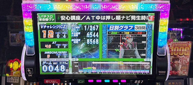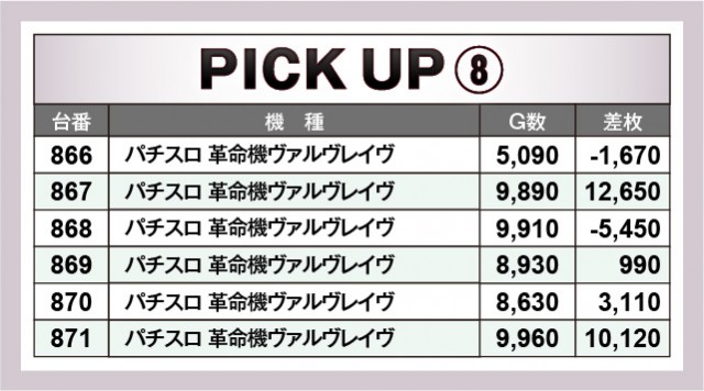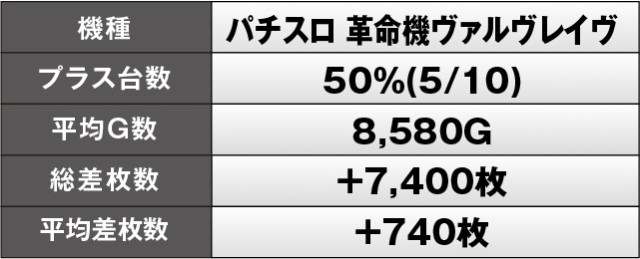 『沖ドキ!GOLD-30』も同様に回転数と差枚数が比例するような展開を披露。しっかりとプラス差枚を達成する台が多く、ファンから信頼されているばかりか、同店からも丁寧に扱われていると分かる。そして『パチスロ 革命機ヴァルヴレイヴ』の好況スポットから2台の万枚OVERが生まれ、同機種らしい性能が存分に発揮されたようだ。