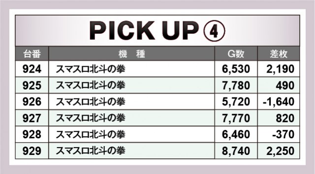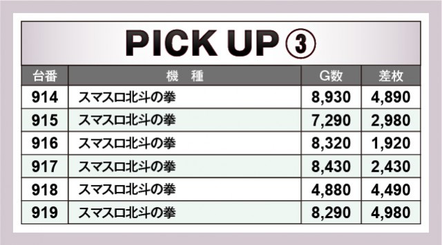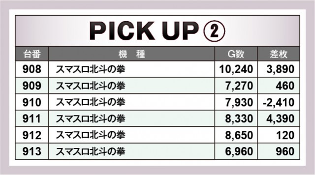 何よりもまず驚きなのが、『スマスロ北斗の拳』から3ヶ所の6台横並び好況スポットを確認できた事実だ。908~913番台・914~919番台・924~929番台と、これらエリアは閉店まで活気が衰える様子がなかった。また『L南国育ち』もパトランプが燦然と光り、ファンはレバーを叩く楽しさを覚えたことだろう。