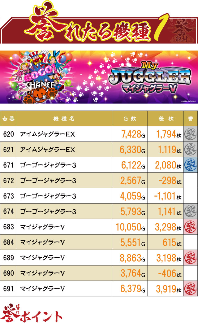 『ジャグラー』シリーズから多くのプラス台が飛び出し、そのほとんどに誉マーキングが。特に『マイジャグラーⅤ』には複数の赤誉マークが付いていた!