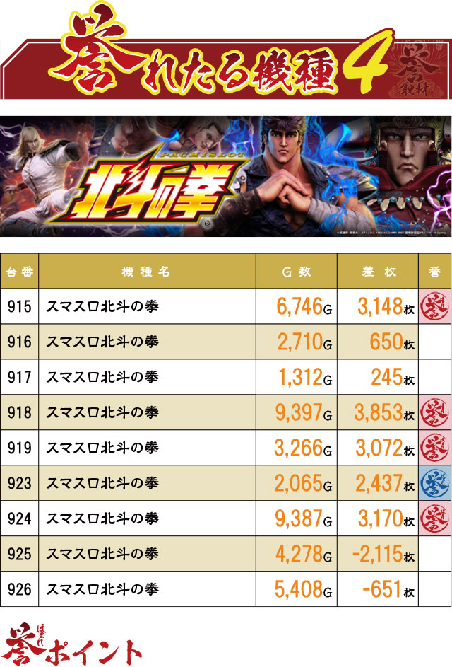 4台並んで優秀台っぽい動きをしている箇所が2つも!やはり常連さん人気の高い『スマスロ北斗の拳』ということで、優秀台が多く潜んでいた…?