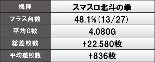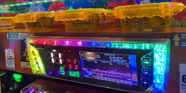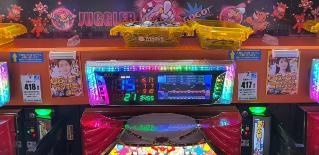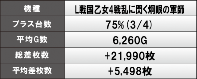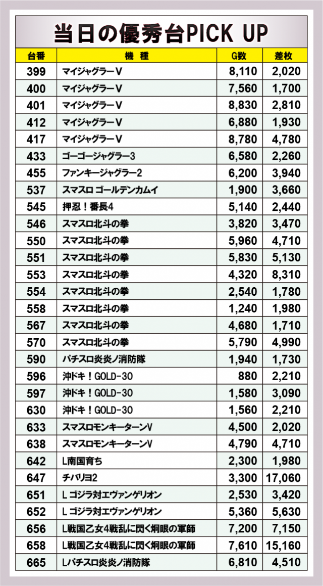 『スマスロ北斗の拳』『L戦国乙女4戦乱に閃く炯眼の軍師』『Lゴジラ対エヴァンゲリオン』の3機種では叩きがいのある状況が整っており、閉店までじっくりと打ち込まれた形跡が見られる。中でも『L戦国乙女4戦乱に閃く炯眼の軍師』は総差枚数5桁を記録するだけでなく、平均差枚数も5千枚OVERを達成。明らかな好感触に遊技するファンは自然と手応えを感じていたはずだ。