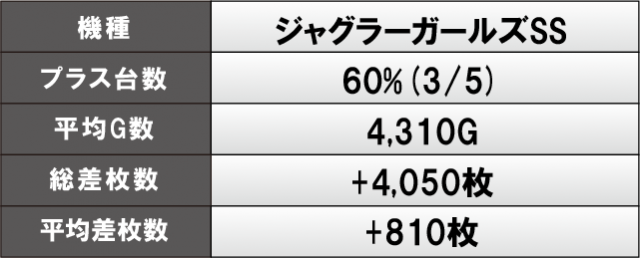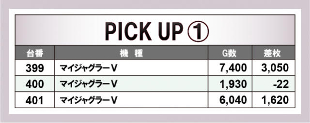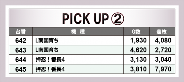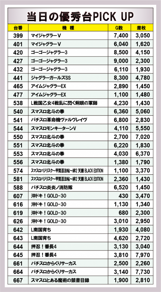 続いては、横並びで盛り上がりをみせていた箇所に注目。『マイジャグラーV』では多くの回転数が記録されるだけでなく、コンスタントな大当りも確認できた。また、『L南国育ち』『押忍!番長4』では機種跨ぎでピックアップ4台全てが+2,000枚オーバーを記録し、人気機種としての実力を発揮していたと言える。