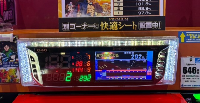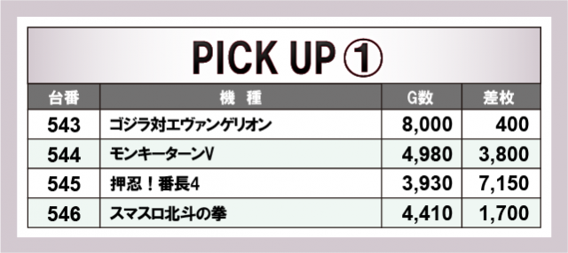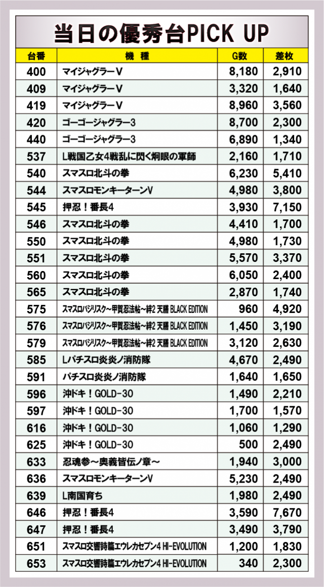 優秀台に目を通してみると、優秀30台のうち20台が+2,000枚オーバーを記録!差枚数で大きな数字を打ち立てたのが、『押忍!番長4』で646番台+7,670枚、545番台+7,150枚や、『スマスロ北斗の拳』540番台+5,410枚が大台突破をマークした。その他、人気スマスロ機を筆頭に『ジャグラー』などノーマルタイプまで様々な機種がランクインしており、各所で熱気と活気に溢れていた。