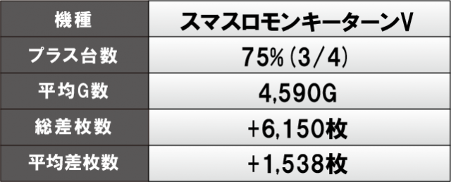 『スマスロモンキーターンV』4台では3台がプラスを達成、うち2台が+2,000枚オーバーをマークし、1台あたりの平均は+1,538枚となった。