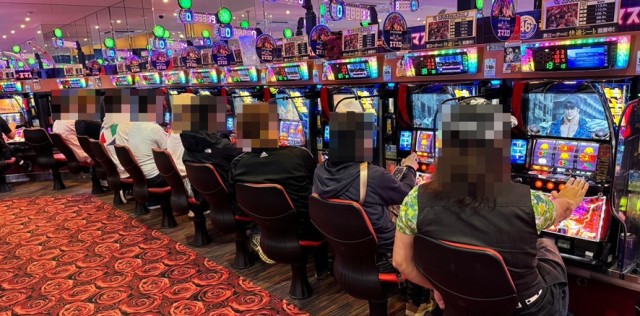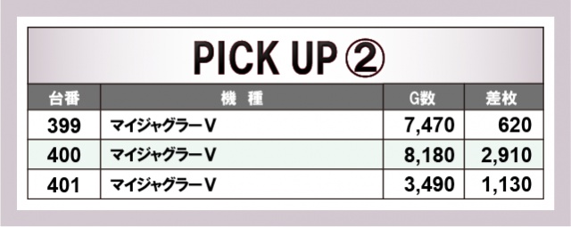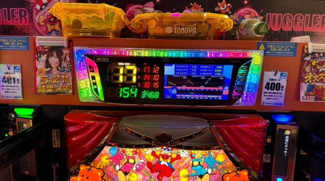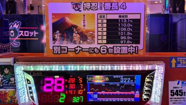 続いては、横並びで盛り上がりをみせていた箇所に注目。スマスロ人気機種が並ぶスポットでは545番台『押忍!番長4』+7,150枚を筆頭に4台全てがプラスで、平均差枚は+3,263枚と文句なしの好結果だった!また、『マイジャグラーV』ではコンスタントな大当りによってGOGOランプの輝きを窺うことができ、ファンを笑顔にした様子だ。