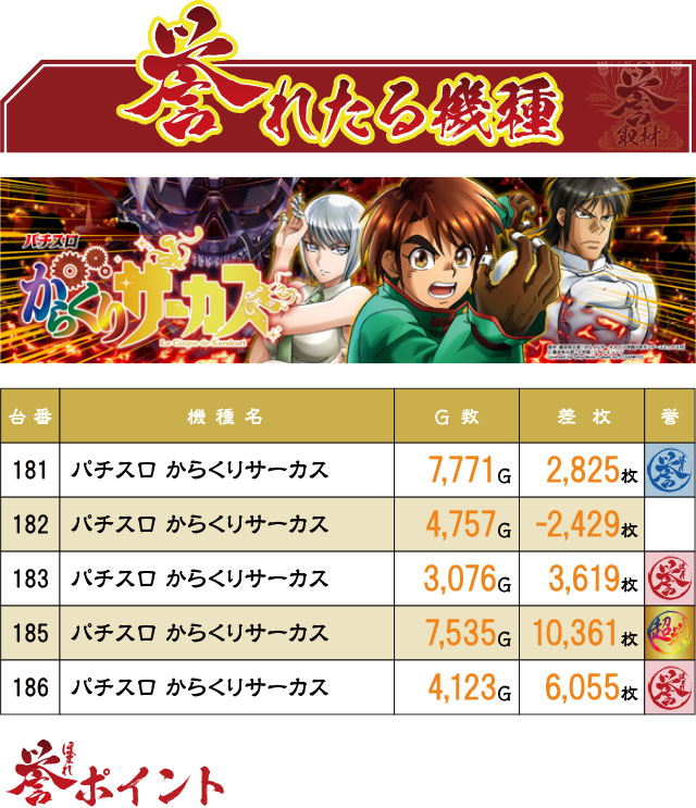 『パチスロ からくりサーカス』が荒ぶる結果を生み出し、大きな注目を集めていた今回。しかし前回と比べると誉マーキングの総台数は少なくなっており、前回のようなパワフルさはナリを潜めていた感は否めない。実力派スロ専として次回しっかりリベンジしてくれるはず!