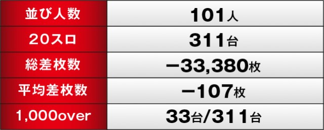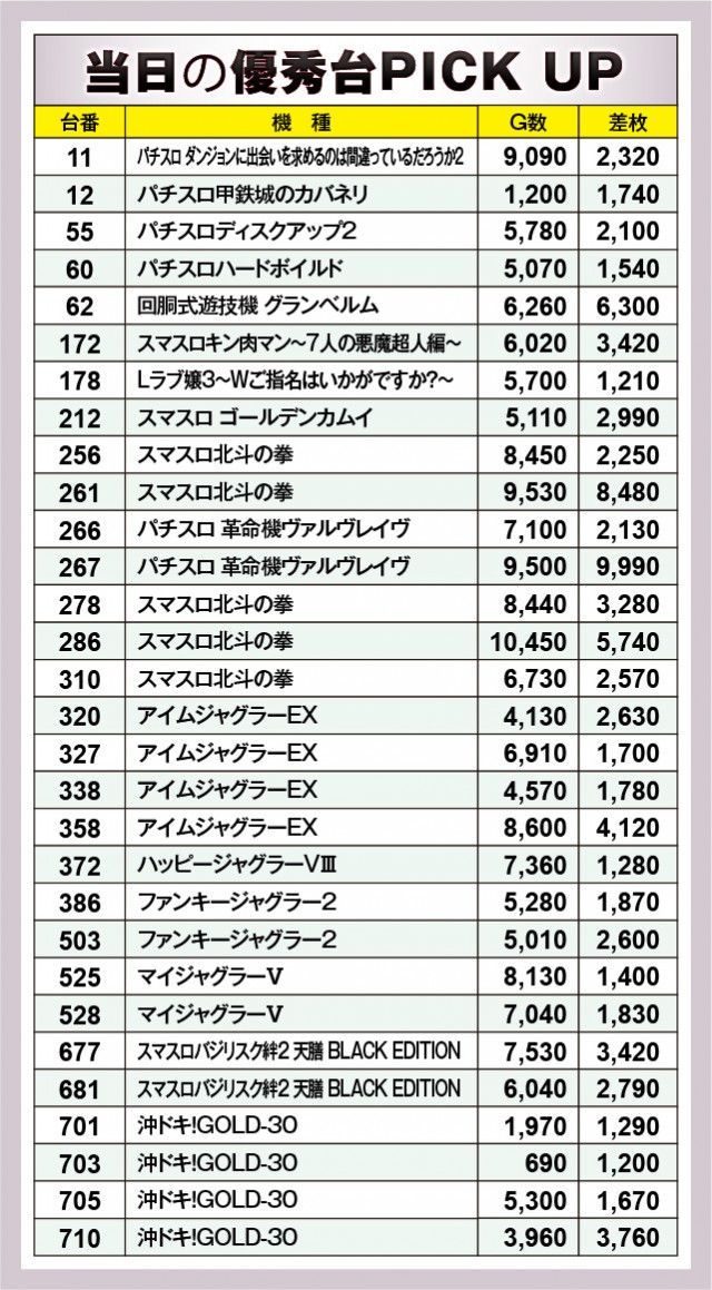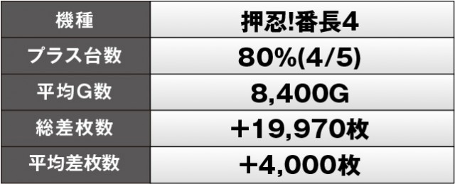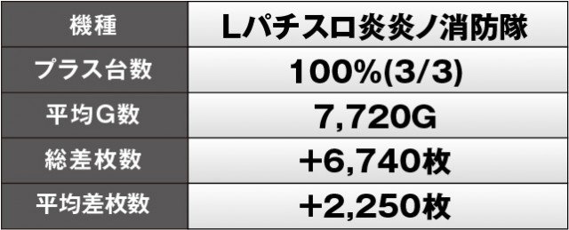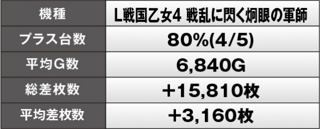 機種単位での活躍を見ると、やはり好感触を掴んでいたのは間違いないだろう。『Lパチスロ炎炎ノ消防隊』は全台プラス差枚を達成し、さらに『押忍!番長4』総差枚数+19,970枚や『L戦国乙女4 戦乱に閃く炯眼の軍師』総差枚数+15,810枚と大きな盛り上がりを披露していた。ファンはすぐに手ごたえを感じては、時間の許す限りレバーを叩いていたことだろう。