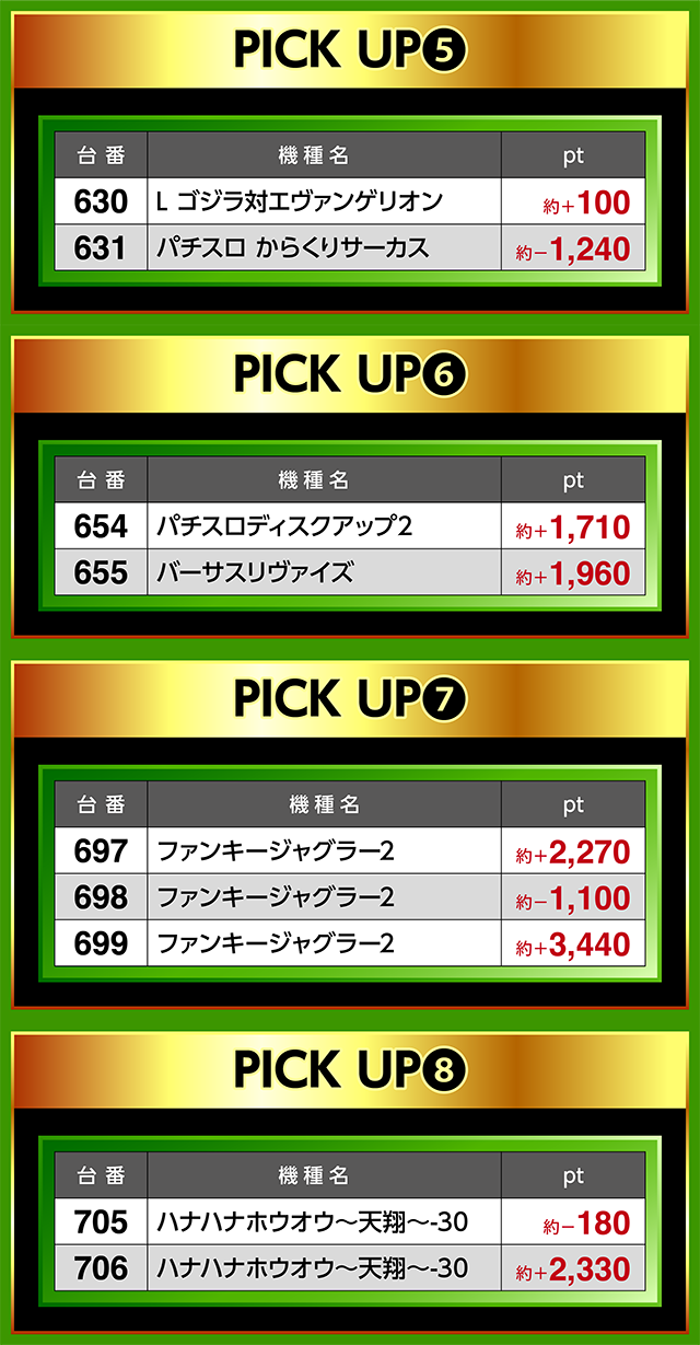 654番台の「パチスロディスクアップ2」と655番台の「バーサスリヴァイズ」は、並んで約+1,700ptオーバー。
