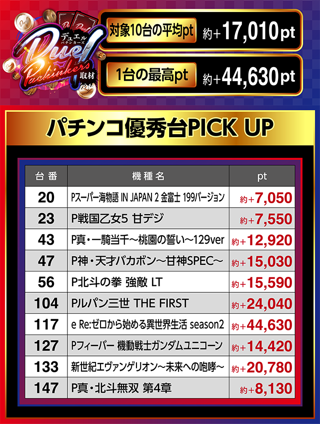 パチスロは「押忍!番長4」に約+10,000ptクラスの台があり、パチンコは「e Re:ゼロから始める異世界生活 season2」に約+44,000ptを超えた台があった。
