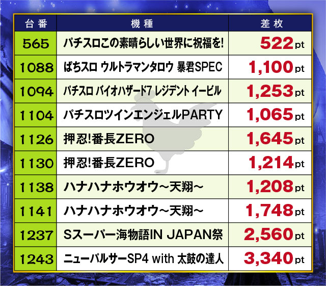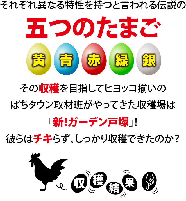 今回「新!ガーデン戸塚」にて全てのたまごを収穫することに成功!初収穫でいきなりの全卵収穫&凄まじい差枚&差玉結果を披露してくれた。相当数の優秀台が潜んでいたのは明白で、当日の盛り上がりは想像以上のものだった様子。次回も全卵収穫ゥ!