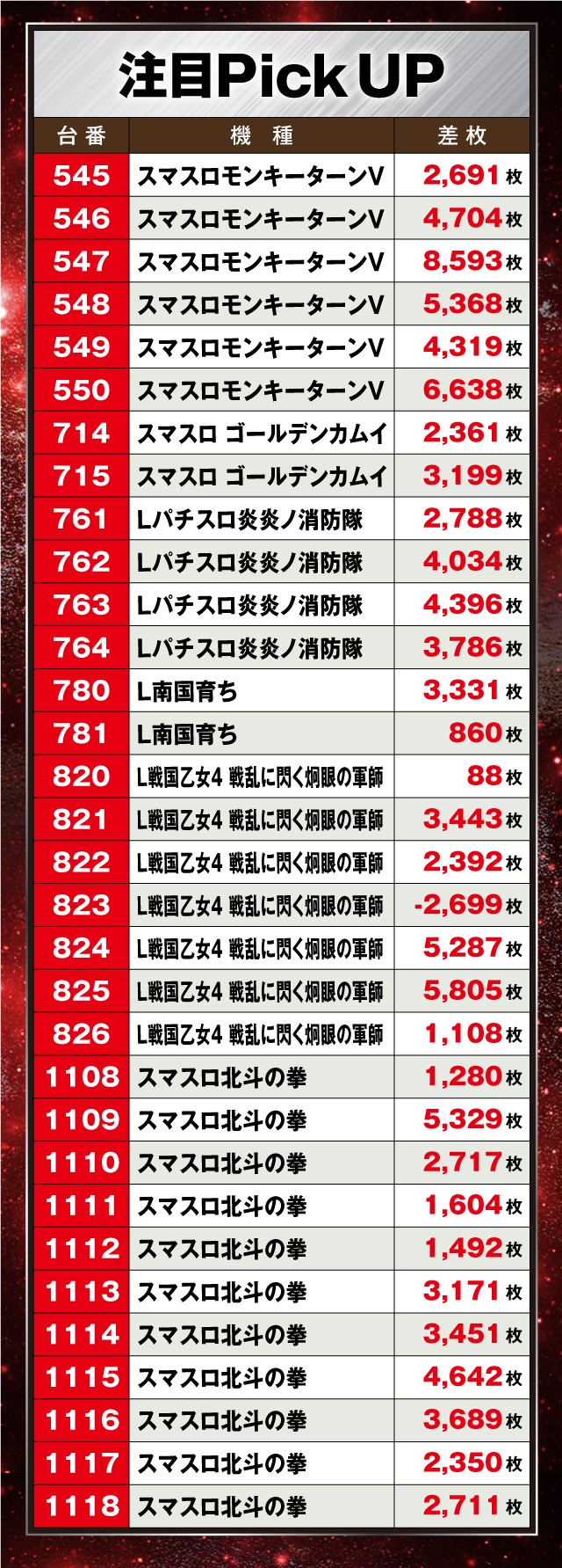 さらに『スマスロ北斗の拳』が+2,949枚、『スマスロ ゴールデンカムイ』が+2,780枚、『L南国育ち』+2,096枚と、すべての並びで平均2,000枚越えとなっていたのだ!