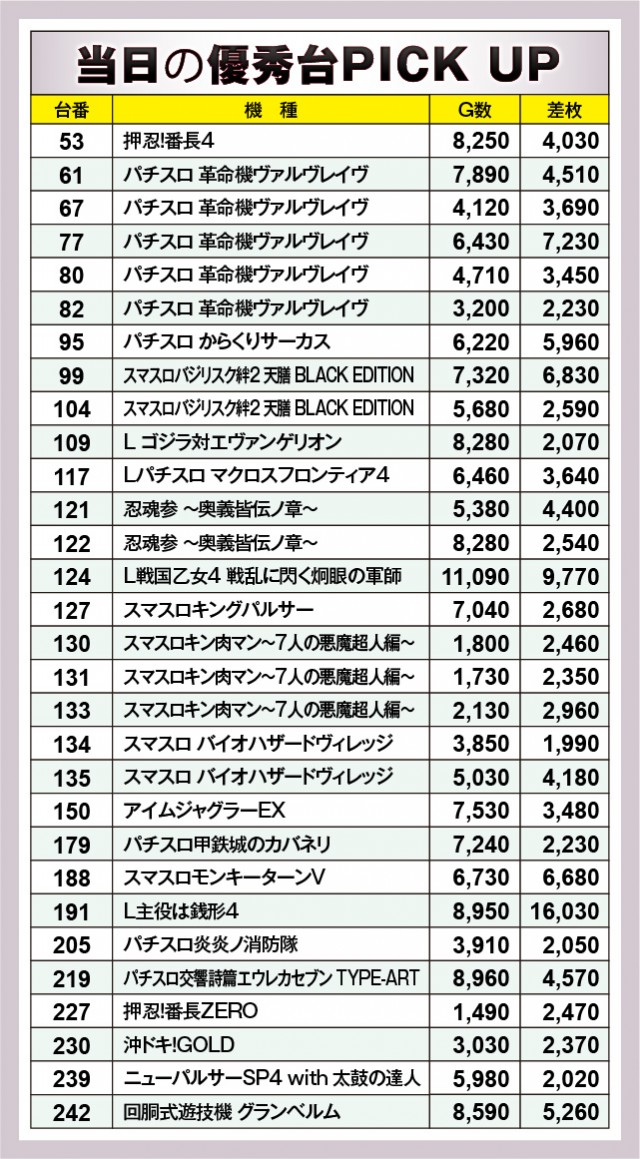 この日、唯一の万枚OVER台となった『L主役は銭形4』からは16,030枚と凄まじい熱気が放たれていた。同時に『L戦国乙女4 戦乱に閃く炯眼の軍師』では9,770枚と万枚未遂の熱量を確認でき、各所で盛り上がっていたのは間違いない。また万回転OVERも確認でき、8千回転台をマークする台も見られることから、打ちごたえのある状況にあったのも容易に想像できる。