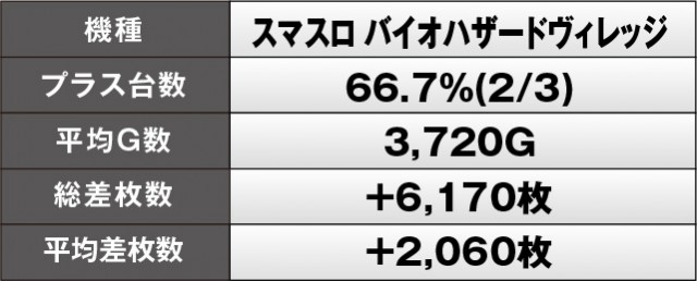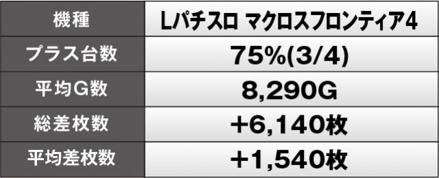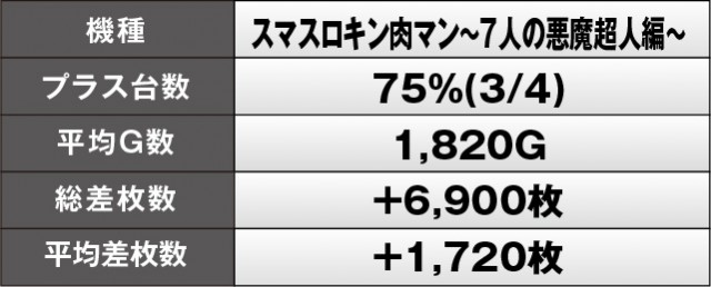 『Lパチスロ マクロスフロンティア4』『スマスロキン肉マン~7人の悪魔超人編~』『スマスロ バイオハザードヴィレッジ』の3機種は、半数以上の台がプラス差枚数を記録していた。特に『Lパチスロ マクロスフロンティア4』は終日を通して打ち込まれており、相当な手応えを感じていたのは間違いない。ただいずれも平均差枚数が4桁をマークしており、熱量的に申し分ない状況だったのもたしかだ。