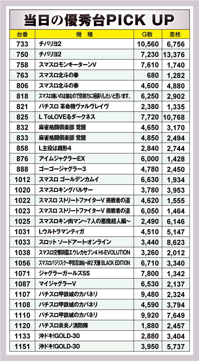 まずは優秀台30台のチェックから。30台のうち22台が+2,000枚オーバーを記録し、+3,000枚オーバーは14台出現。さらに+10,000枚オーバーは2台出現する盛況ぶりをみせていた。それらのなかでもっとも優秀だったのは、750番台の「チバリヨ2」で、差枚+13,376枚と圧倒的な数値をマーク! またランクイン機種を見渡すと、最新台スマスロを筆頭に多種多様な機種がランクインしていたので、店内の至る所にチャンスが隠されていた可能性が高そうだ!