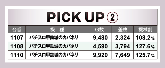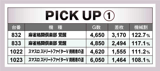続いては、当日特に賑わっていた2箇所を紹介しよう。まずは「麻雀格闘倶楽部 覚醒」〜「スマスロ ストリートファイターV 挑戦者の道」は、ピックアップ4台のうち2台が+2,000枚オーバーをマークし、平均差枚も+2,171枚を記録。そして「パチスロ甲鉄城のカバネリ」は、3台並びすべてが+2,000枚オーバーを達成し、平均差枚も+4,589枚を記録。このように、人気のスマスロ以外にも様々な機種が高いパフォーマンスを見せていたので、店内の至る所にチャンスが隠されていた可能性が高いと言えるだろう!