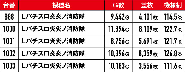 これぞミラクル!5台設置の『Lパチスロ炎炎ノ消防隊』は、全台が+3,500枚オーバーというとんでもない結果に。5台ともに機械割111%超え。これを見て全台系を疑わない人はいないだろう。