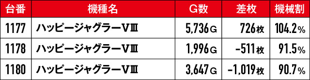 3台ともに挙動の悪くなかった『ハッピージャグラーⅤⅢ』。しかし5,000Gも回されなかった2台はマイナスに、5,000G以上回された1177番台のみプラスという結果。3台とももっと回されるべきだった…!