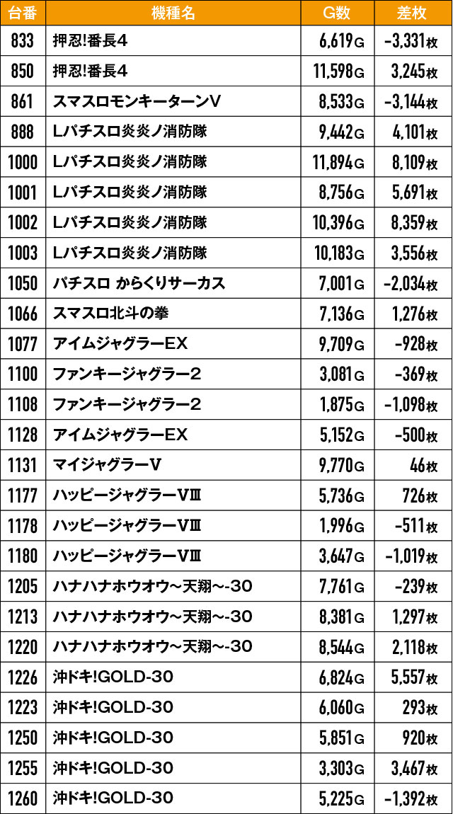 その他にも優秀台挙動を見せた台は多数!中にはマイナスに陥ってしまった台もあるが、+3,000枚オーバーを果たした台もチラホラ。しっかりと優秀台の存在を感じさせてくれた。