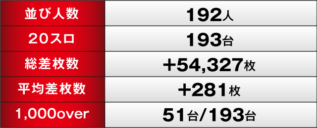 終わってみれば優秀台、ピックアップ機種ともに好調で、トータルの差枚数は+54,327枚をマーク。1,000over台も51台/193台を記録しており、抜群の安定感を見せている。この調子で7月もさらなる飛躍を期待したい。