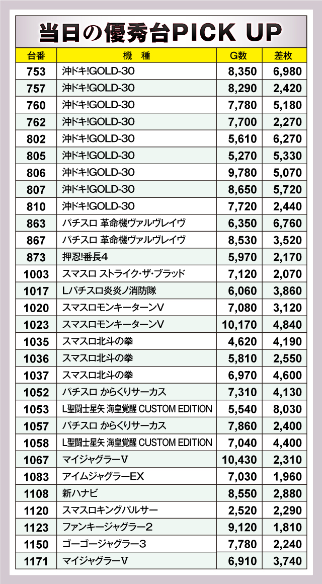 優秀台を見てみると、『L聖闘士星矢 海皇覚醒CUSTOM EDITION』が素晴らしい成績をあげた。1053番台が+8,030枚、1058番台が+4,400枚を記録。さすが人気シリーズの最新機種らしい実力を見せてくれた。それに続いたのが『沖ドキ!GOLD-30』。753番台の+6,980枚を筆頭に、802番台が+6,270枚、807番台が+5,720枚と優秀台がズラリと並んだ。僅差で続いたのが『パチスロ 革命機ヴァルヴレイヴ』で、863番台が+6,760枚をマークしている。スマスロの元祖として、まだまだ人気も実力も健在だ。以下、+4,840枚の『スマスロモンキーターンV』1023番台、+4,600枚の『スマスロ北斗の拳』1037番台、+4,130枚の『パチスロ からくりサーカス』などが盛り上がりを見せていた。