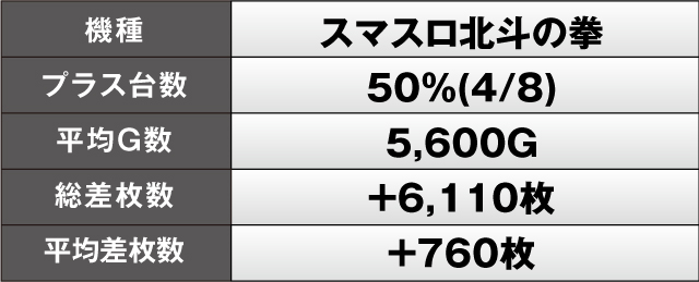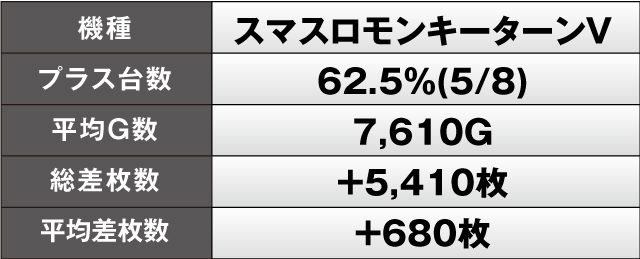 ピックアップ機種では、まず『沖ドキ!GOLD-30』。18台中14台がプラスで、プラス台率は77.8%にも及んだ。平均差枚数も+2,000枚を越えており。まさにシマは大盛り上がりだった。『スマスロ北斗の拳』も上々で、8台中4台がプラスを計上した。他では、平均差枚こそ『北斗』より少なかったが、8台中5台がプラスを記録した『スマスロモンキーターンV』が目立っていた。