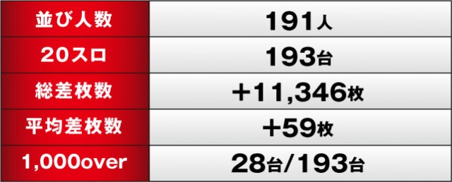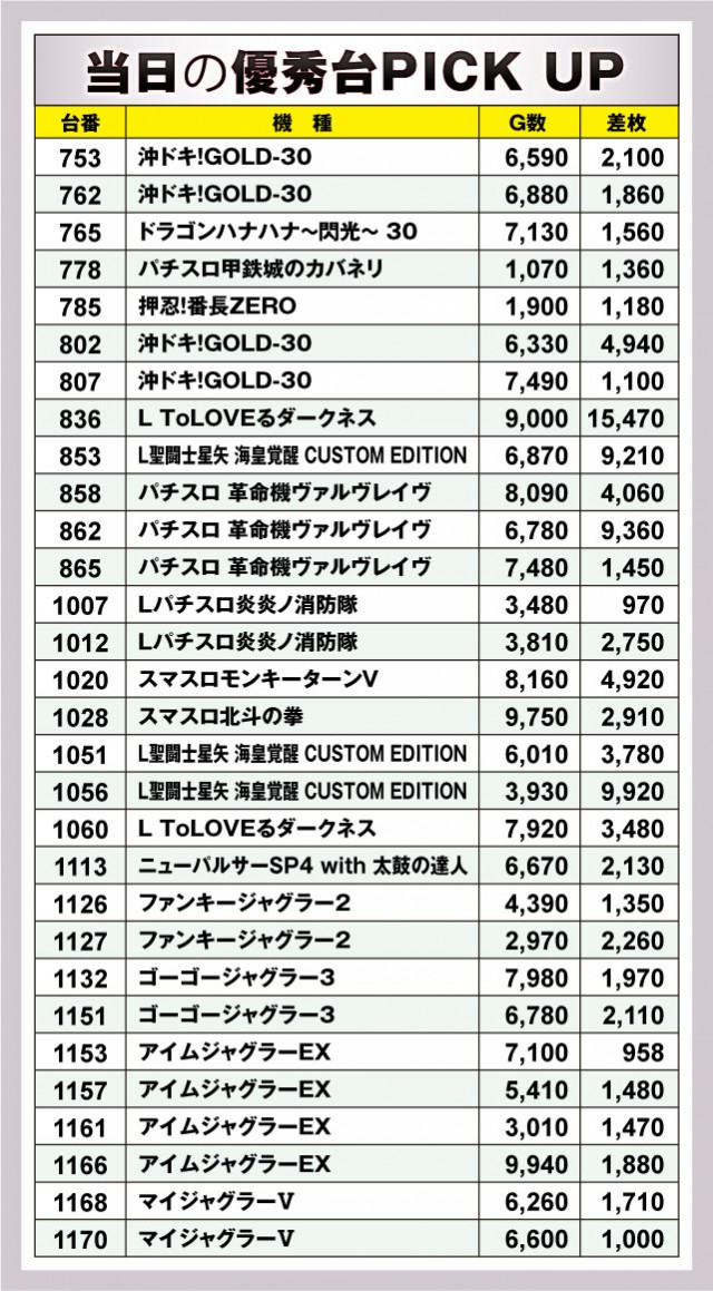 傾向としては新機種の『L ToLOVEるダークネス』と『L聖闘士星矢 海皇覚醒 CUSTOM EDITION』にしっかりとした差枚数が出ていたのでコチラも勝利の一因となっていたと思われる。