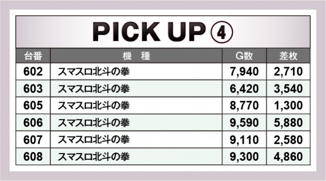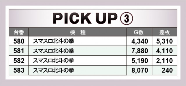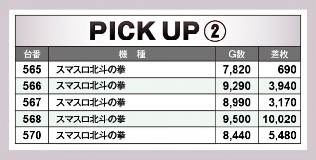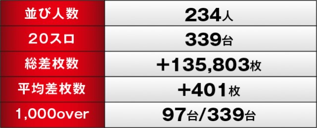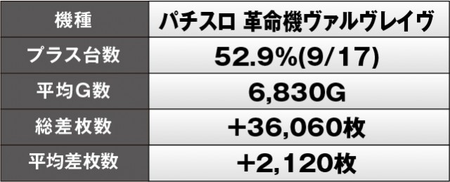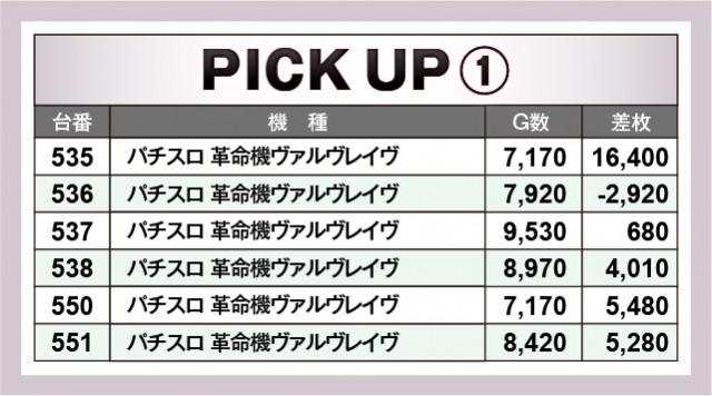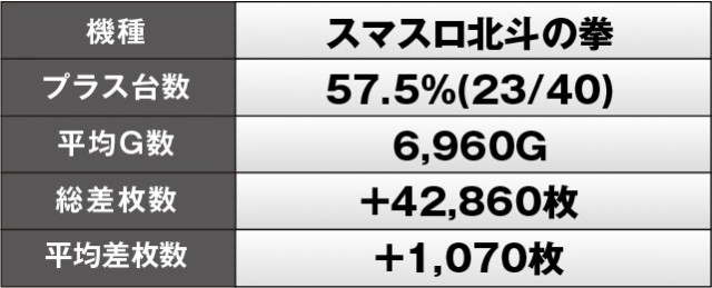 くどいようだが、『パチスロ 革命機ヴァルヴレイヴ』『スマスロ北斗の拳』の二大巨頭は、回転数と差枚数ともに申し分ない結果を残している。万枚OVERという数字に目を奪われがちではあるものの、特に後者は右肩上がりのグラフを描いているのが鮮烈だ。これら好況スポットではまとまった出玉を獲得されている事実も確認でき、ファンは有意義な時間を過ごせたのは間違いない。