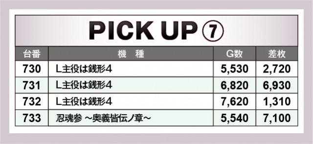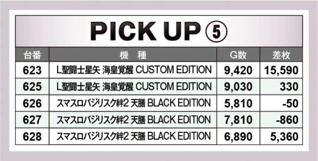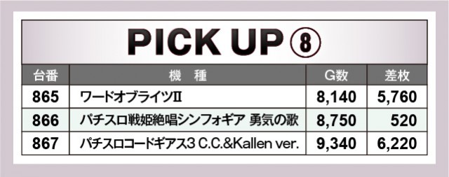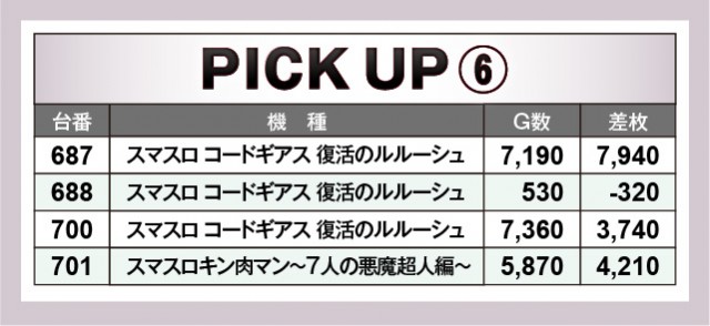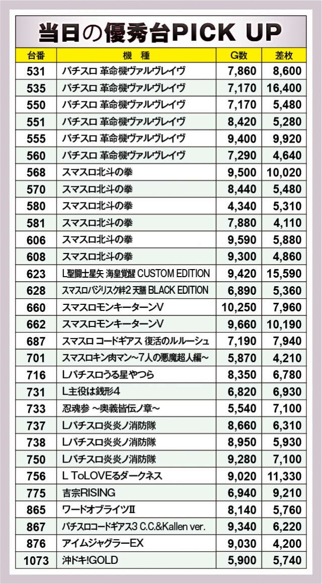 『L聖闘士星矢 海皇覚醒 CUSTOM EDITION』623番台+15,590枚と、登場して間もない新台がさっそく活躍を披露してみせた。他にも『スマスロ コードギアス反逆のルルーシュ/復活のルルーシュ』687番台+7,940枚や『L主役は銭形4』731番台+6,930枚、『ワードオブライツⅡ』865番台+5,760枚など、大台突破台が存在しているのも見逃せない。可能性をしっかりと見抜き、ファンは力強くレバーを叩いていたことだろう。