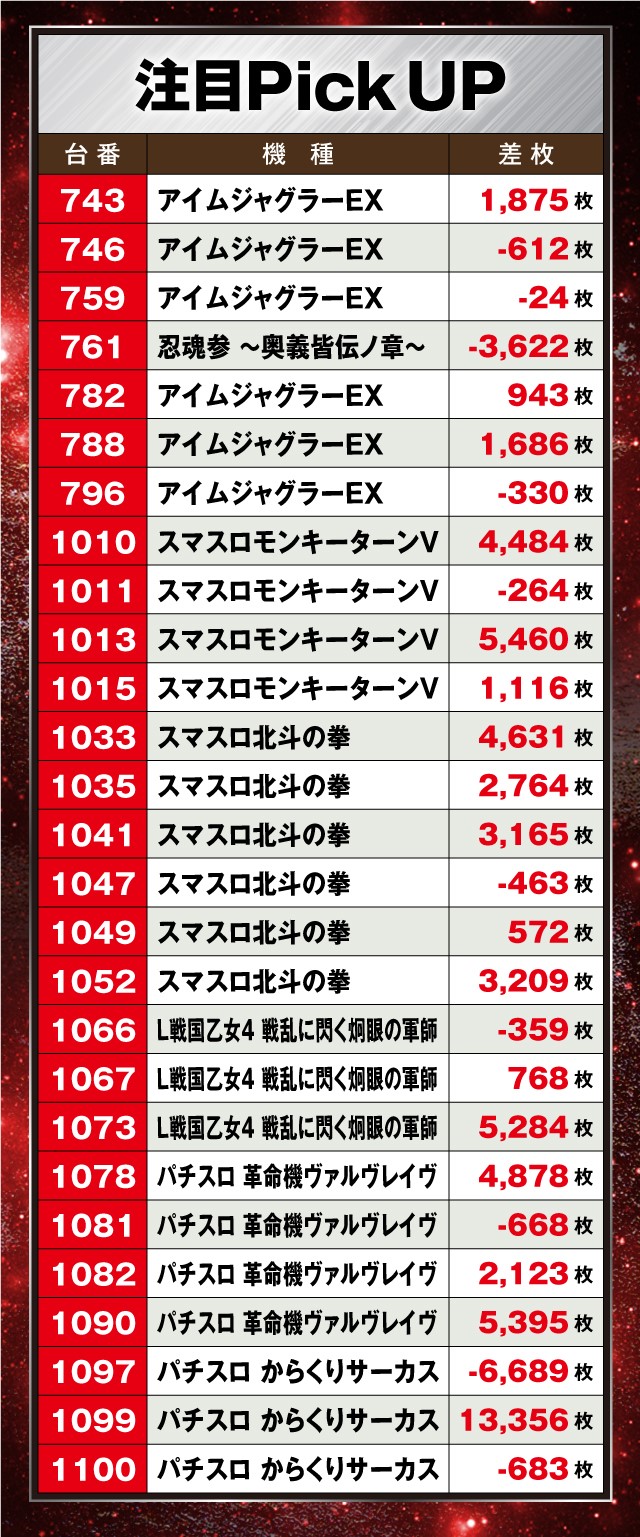 特に『パチスロ からくりサーカス』の注目度が高く、1099番台は+13,356枚とスマスロのポテンシャルをいかんなく発揮している!