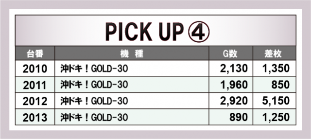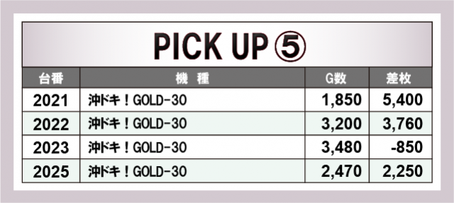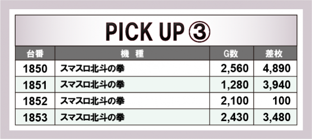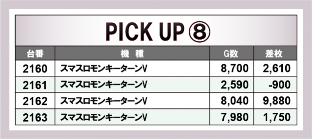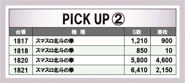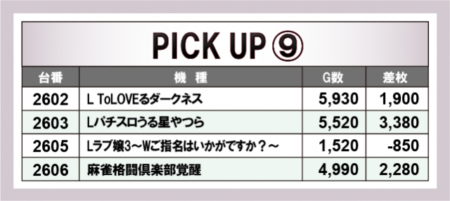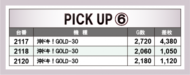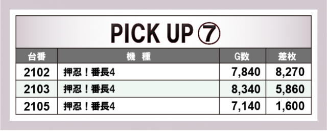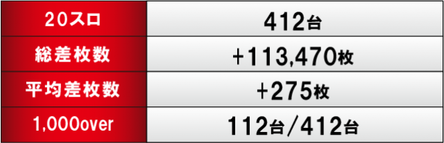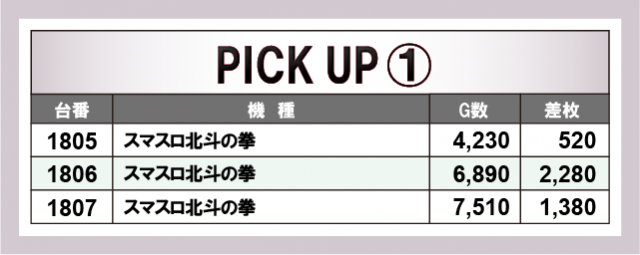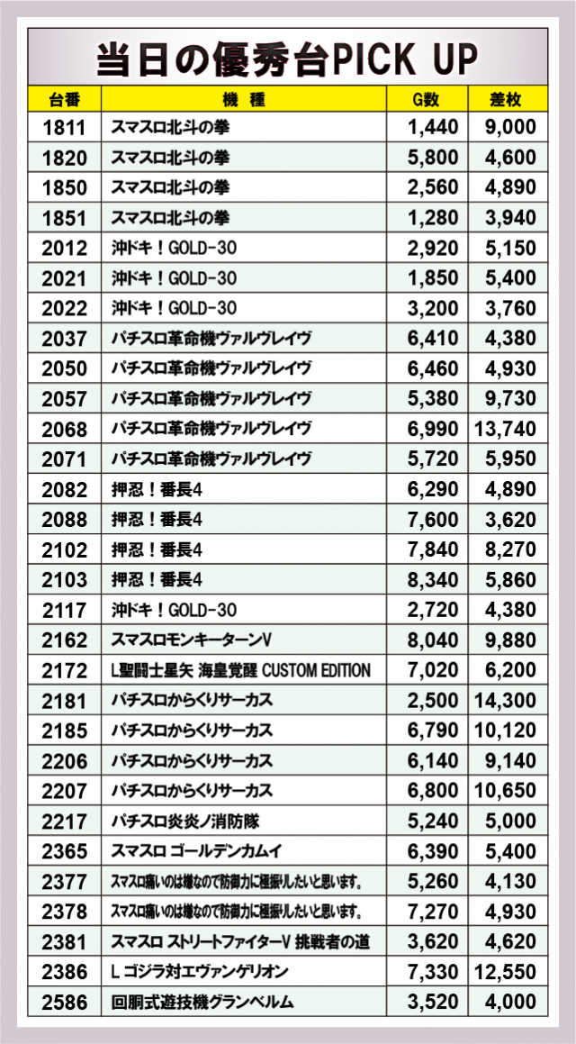 続いて、上表を見て分かる通り、人気機種を中心に横並び好況スポットが多数発生していたのが目に焼きつく。各所で高い活気と熱気に満ちており、打ちごたえのある状況が整っていたことから館内の盛り上がりに大きく貢献していたと言える。