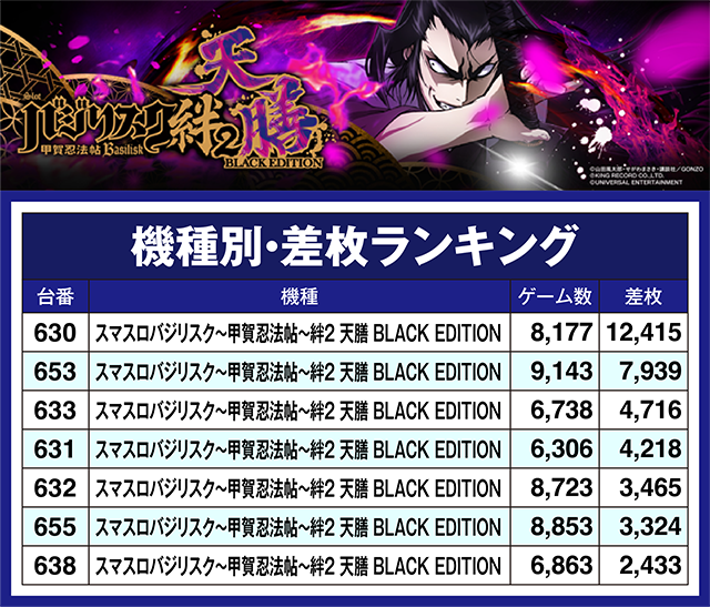 「スマスロバジリスク~甲賀忍法帖~絆2 天膳 BLACK EDITION」の630番台は12,415pt。
