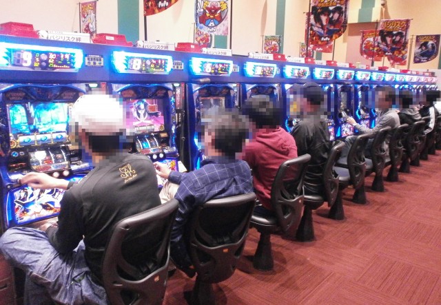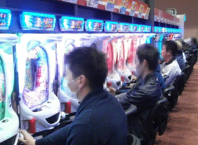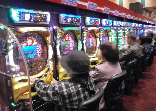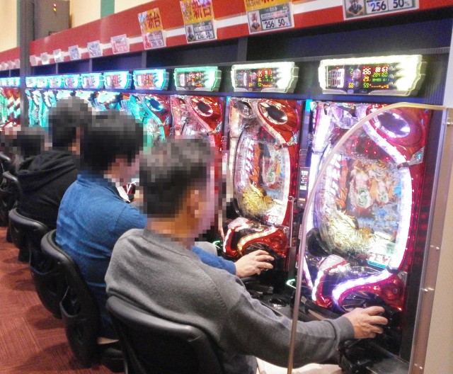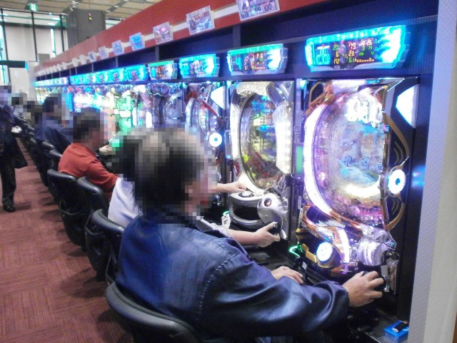 4円パチンコのコーナーでは、新台の「CR花の慶次X~雲のかなたに~」をズラリと一列に揃えて設置されており、機種のタイプを確かめながら楽しむプレイヤーたちの和やかな表情が印象的だった。