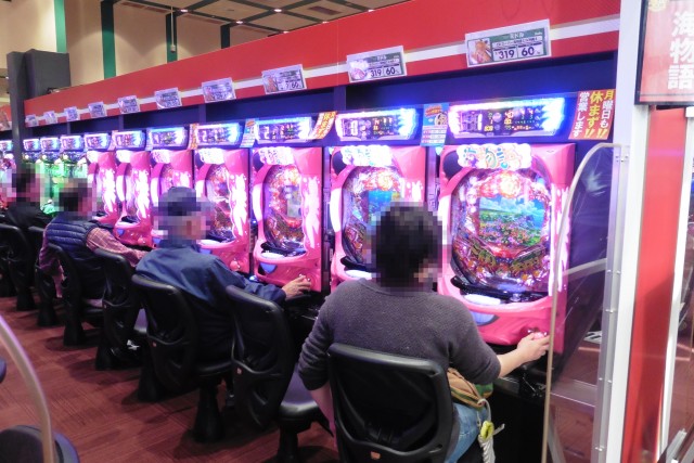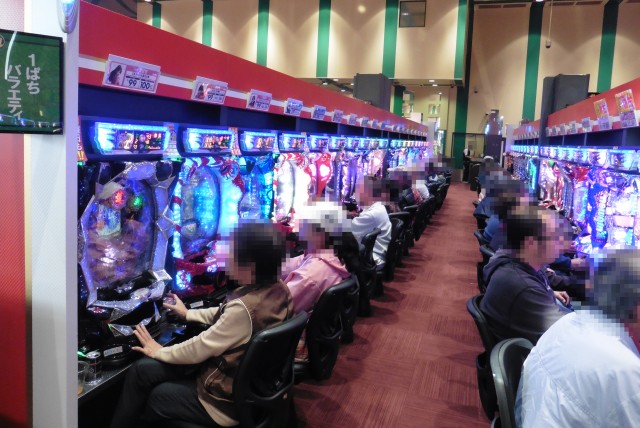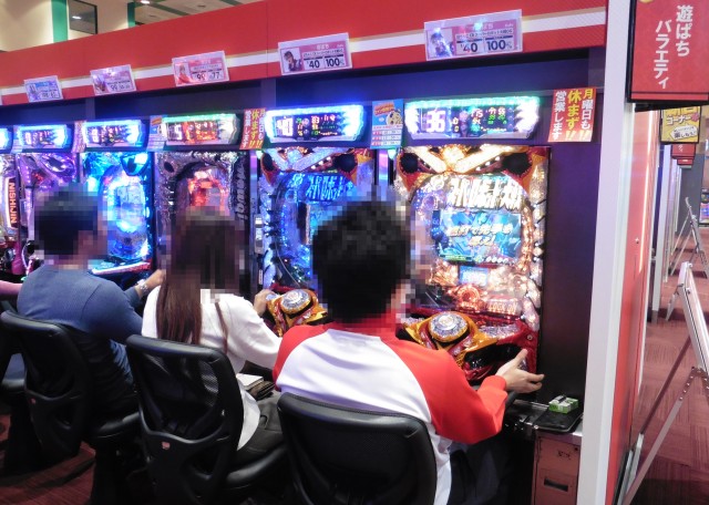 4円パチンココーナーでは、衰えることのない人気の海物語シリーズの中でも、「CRスーパー海物語IN沖縄4マリンシェルビビッドピンクバージョン」が中高年層には大人気。落ち着いた雰囲気の中でなごやかな笑顔が広がっていた。