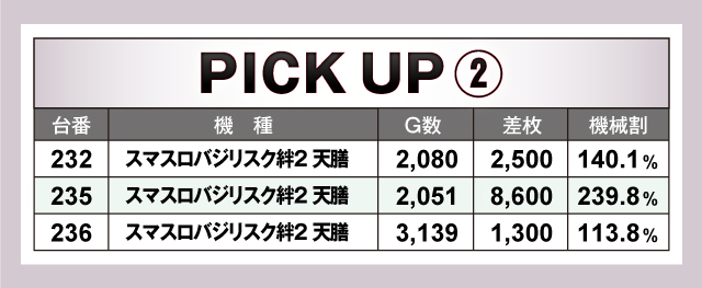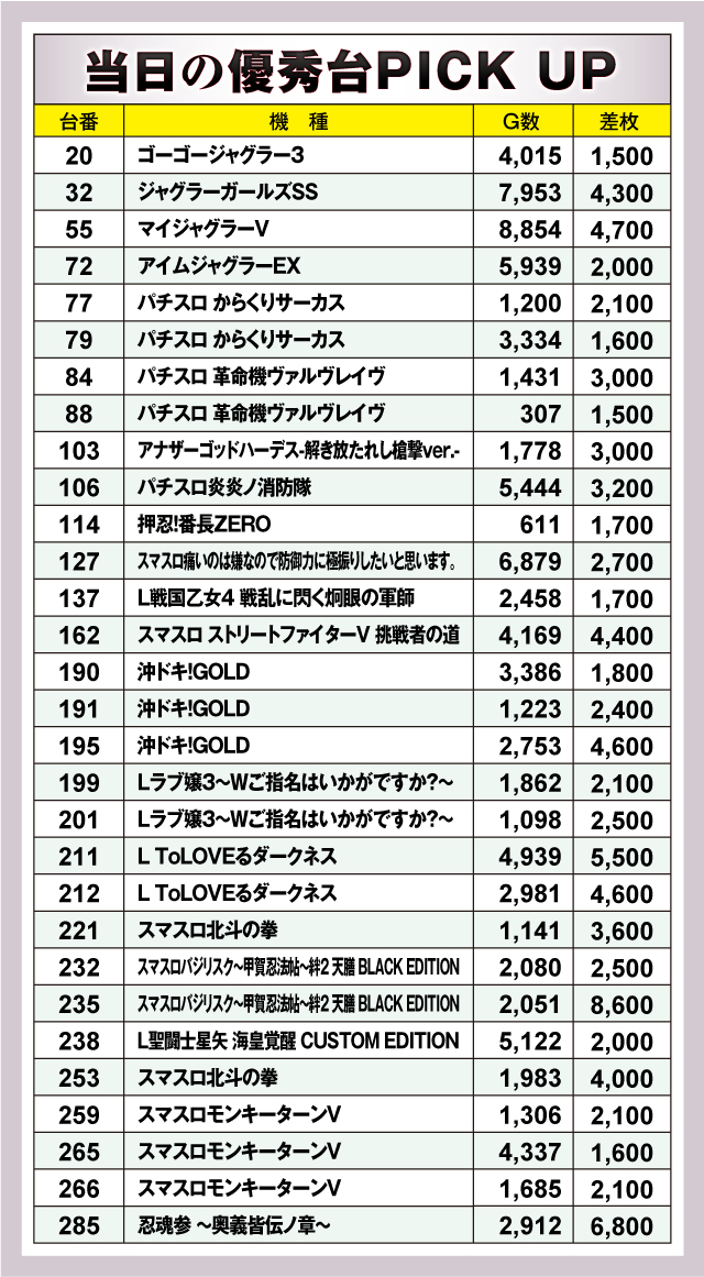 まずは優秀台30台のチェックから。30台のうち23台が+2,000枚オーバーを記録し、+3,000枚オーバーは13台出現。それらのなかでもっとも優秀だったのは、235番台の「スマスロバジリスク~甲賀忍法帖~絆2 天膳 BLACK EDITION」で、差枚+8,600枚を獲得! またランクイン機種を見渡すと、最新台や人気台のスマスロが多くを占めるなか、ジャグラーシリーズも複数ランクイン。店内の至る所にチャンスが隠されていたようだ!