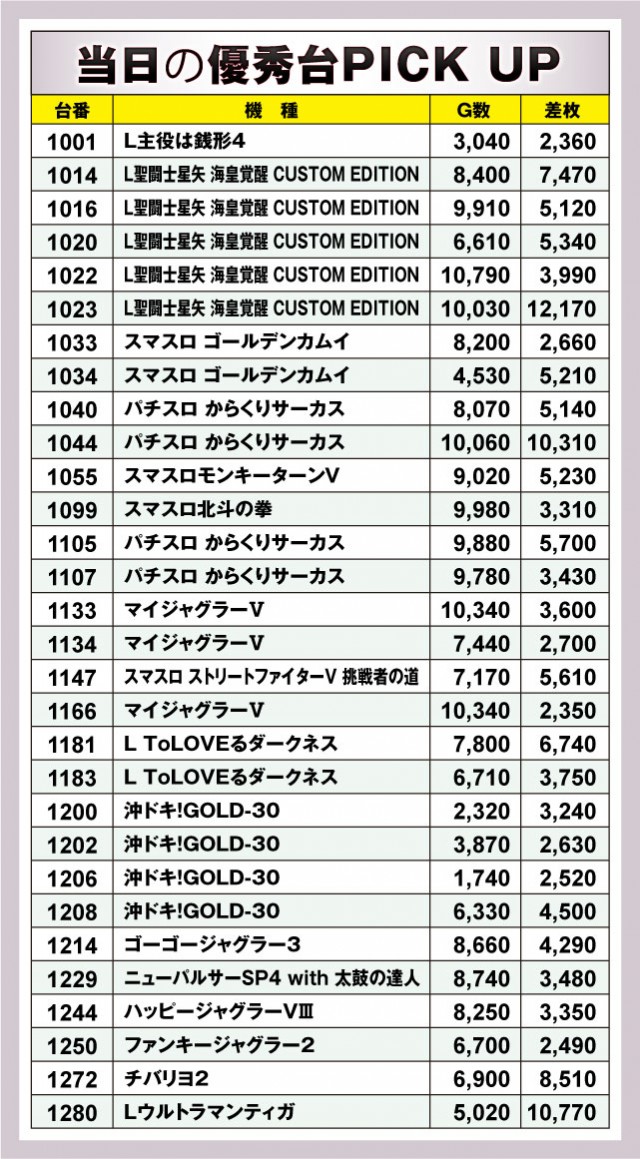 この週から導入が開始された注目の新機種『L聖闘士星矢 海皇覚醒 CUSTOM EDITION』から、なんと5台も優秀台に! しかも1023番台から万枚オーバーが炸裂している。残り4台の優秀台もしっかりとした差枚数が出ており、星矢の出玉性能の高さが伺えた。