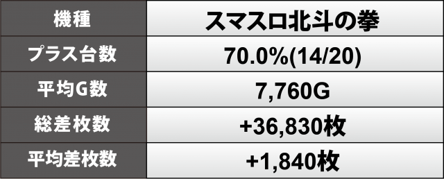 『スマスロ北斗の拳』20台では7割となる14台がプラス、+8千5百枚弱&+8千2百枚弱の2台の下にも+6千枚超×1&+5千枚超×1&+4千枚超×2と好況を誇り、その合算では+3万7千枚弱を計上。