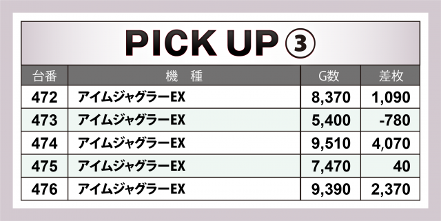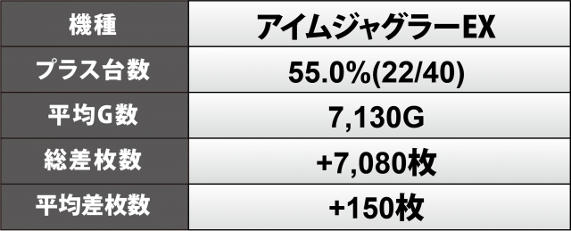『アイムジャグラーEX』40台では勝率6割近くとなる22台が黒字を成就。474番台が+4千1百枚弱というスマッシュヒットとなったことが印象深い。