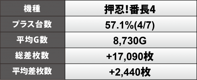 『アイムジャグ』と同等となる6割弱のプラス率だったのが『押忍!番長4』7台。 +6千1百枚超&+5千8百枚弱をツートップに、総計では+1万7千枚超、1台あたりの平均は+2千4百枚超と、ここで取り上げた3機種の中では最も高い水準となった。
